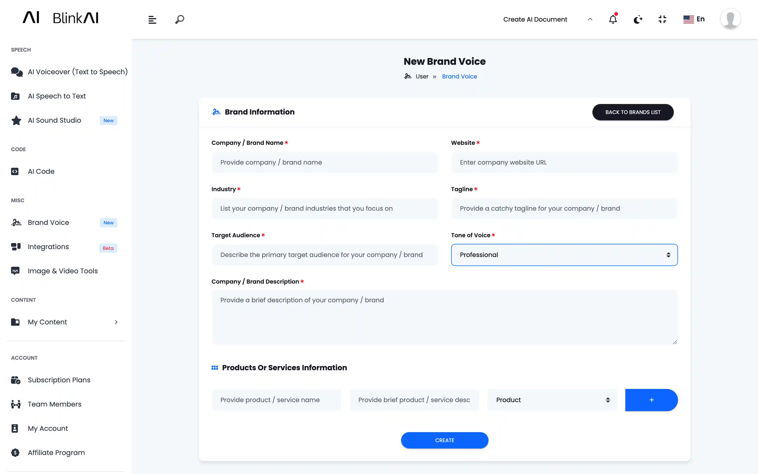 Enter details like Company/Brand Name, Website, Industry, Tagline, Target Audience, Tone of Voice. Add products and services. Briefly describe the products and services.