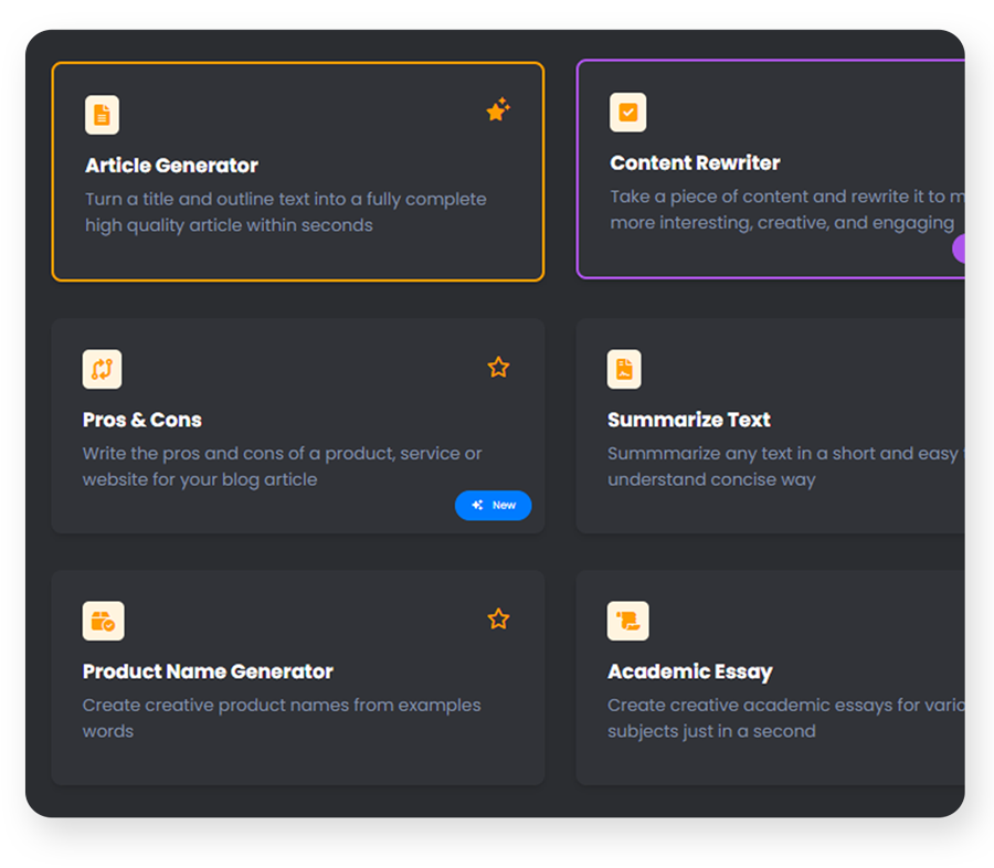 AI Article Wizard - Create long articles with our 4 step AI Article Wizard. It let’s you choose keywords, create sections and create outlines for each section of the article/blog. It can also generate AI image related to your article with the help of Dall-E all with just a few clicks and short description.